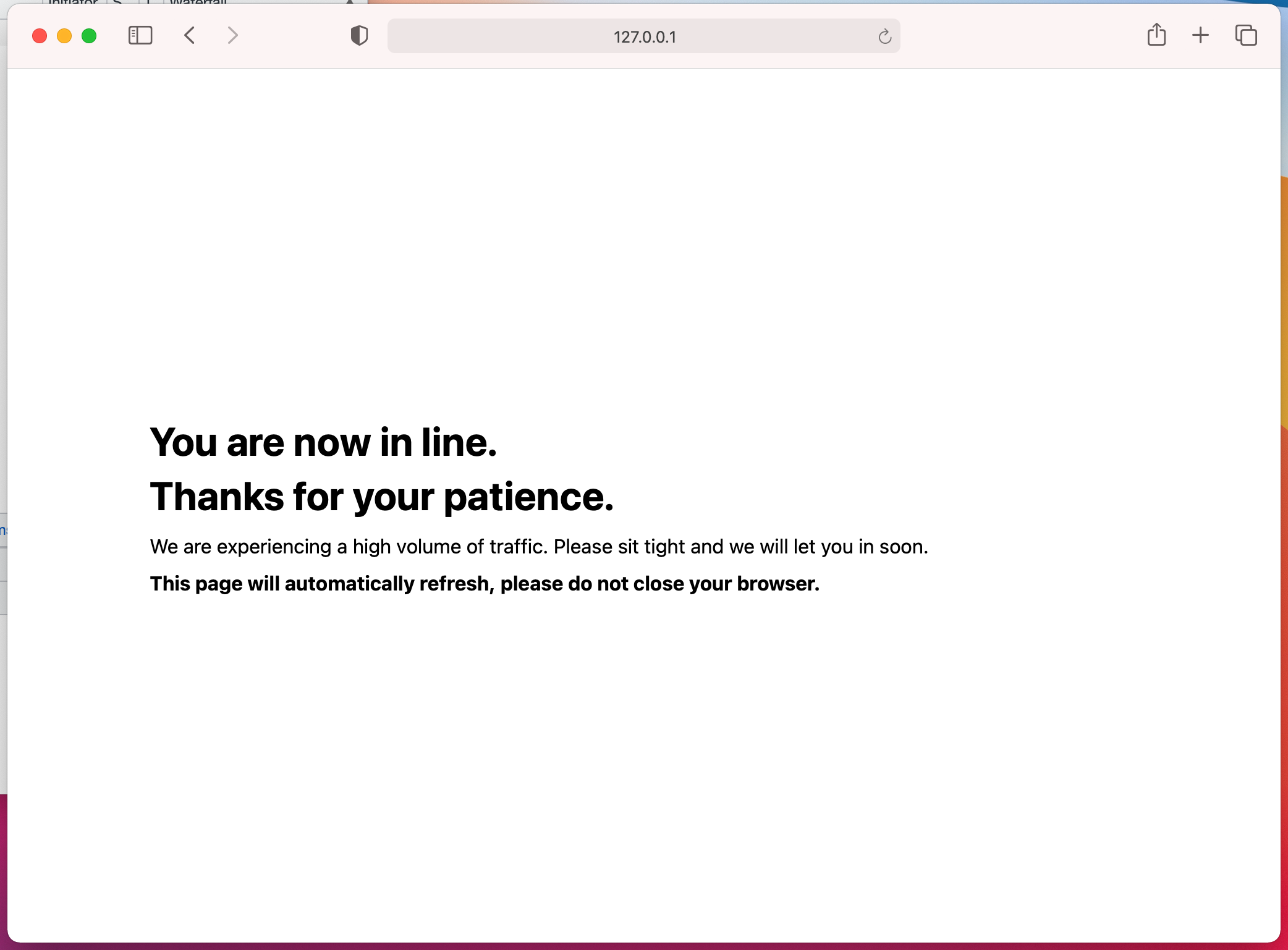 Visit this site from a different browser, you will be forwarded to the waiting room when the capacity is full.